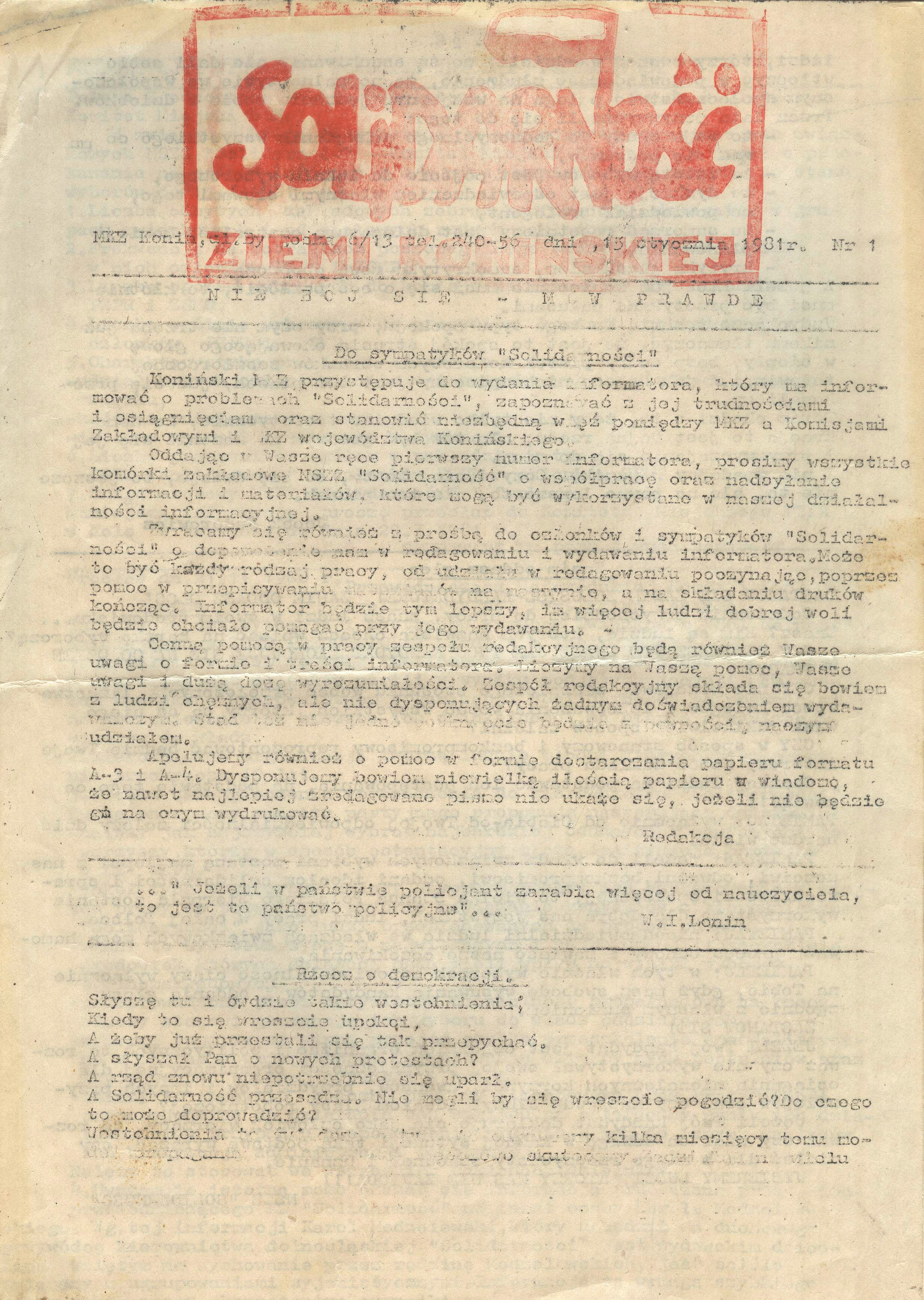 Pismo niezależne o charakterze publicystyczno–informacyjnym wydawane w Koninie w okresie 15 I – 15 VI 1981, ukazało się 21 nr.  (prawdopodobnie również nr 22-24 z datą: 22, 29 VI, 6 VII 1981); o obj. 8 s., formacie A4, A5, drukowane na powielaczu, nast. offsecie. Redaktor nacz. Zbigniew Okoński; autorzy artykułów, m.in.: Tadeusz Gierłowski, Ryszard Stachowiak, Lech Stefaniak, Ryszard Skoczylas, Wojciech Zaleski.